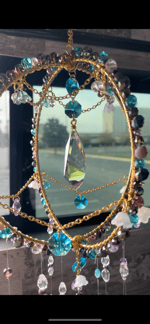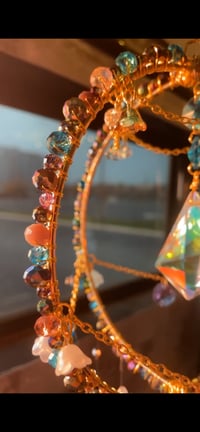 Annie features 2 gold 6” macrame hoops secured as a 3D globe, then wrapped in colorful glass faceted beads.