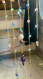 Beneath feature the same 5 strands of dozens of faceted beads of all colors. Without chain it hangs 18", with hanging chain the total length is 26"