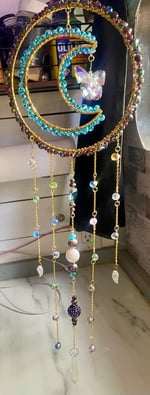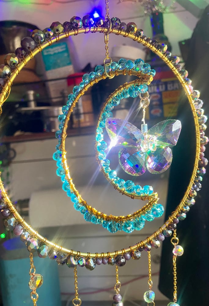Gold 4" moon ring wrapped sky blue faceted beads. The outer 6" ring is wrapped with rainbow & purple faceted beads. The center features a large purple faceted butterfly bead that will stun you with its beauty.